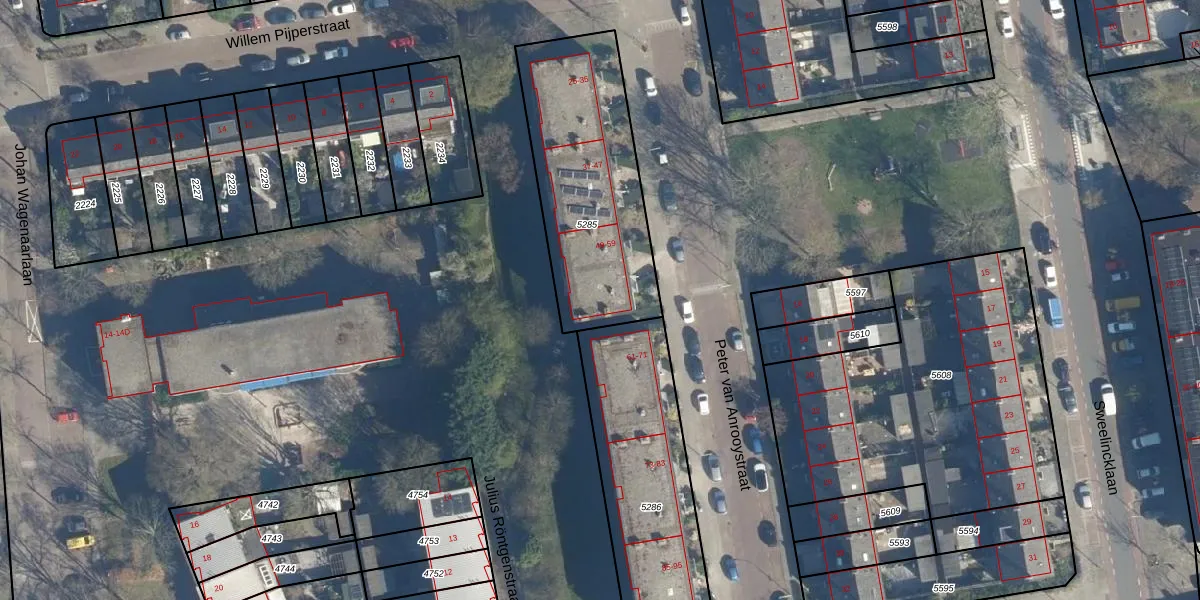 Het perceel waarop Peter van Anrooystraat 59 staat heeft een oppervlakte van 823 m². Dit is een groot perceel. De perceeloppervlakte wordt geregistreerd door het Kadaster. Gedetailleerde informatie over de maten van dit perceel kunt u vinden in het rapport Kadastrale kaart met maatvoering van Peter van Anrooystraat 59.