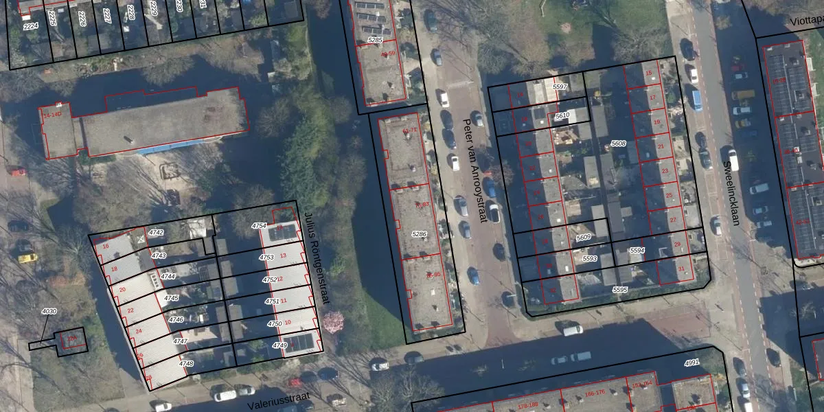 Het perceel waarop Peter van Anrooystraat 77 staat heeft een oppervlakte van 827 m². Dit is een groot perceel. De perceeloppervlakte wordt geregistreerd door het Kadaster. Gedetailleerde informatie over de maten van dit perceel kunt u vinden in het rapport Kadastrale kaart met maatvoering van Peter van Anrooystraat 77.