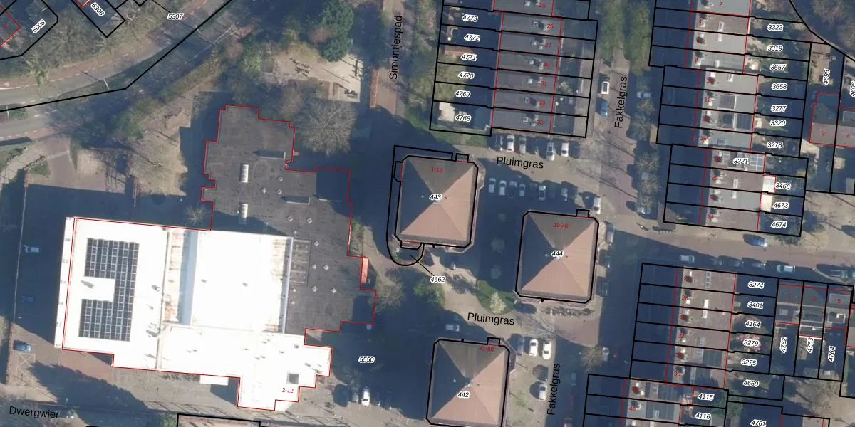 Pluimgras 12 is gelegen op kadastraal perceel LDN01S443. Deze kadastrale aanduiding is uniek en wordt gebruikt door het Kadaster om eigendomsrechten en andere zakelijke rechten vast te leggen. Het perceel maakt onderdeel uit van de kadastrale gemeente Leiden.