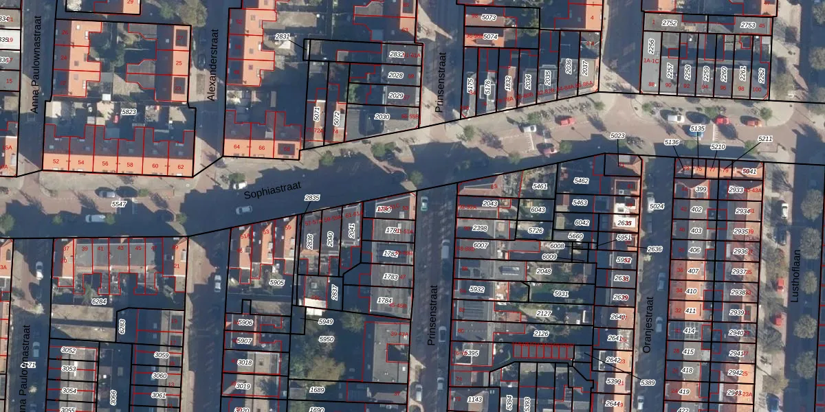 Het perceel waarop Prinsenstraat 53 staat heeft een oppervlakte van 71 m². Dit is een klein perceel. De perceeloppervlakte wordt geregistreerd door het Kadaster. Gedetailleerde informatie over de maten van dit perceel kunt u vinden in het rapport Kadastrale kaart met maatvoering van Prinsenstraat 53.