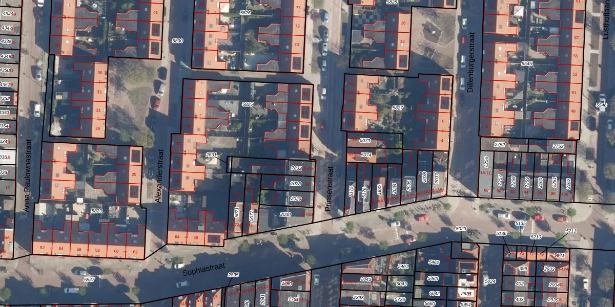 Het perceel waarop Prinsenstraat 63 staat heeft een oppervlakte van 1645 m². Dit is een zeer groot perceel. De perceeloppervlakte wordt geregistreerd door het Kadaster. Gedetailleerde informatie over de maten van dit perceel kunt u vinden in het rapport Kadastrale kaart met maatvoering van Prinsenstraat 63.