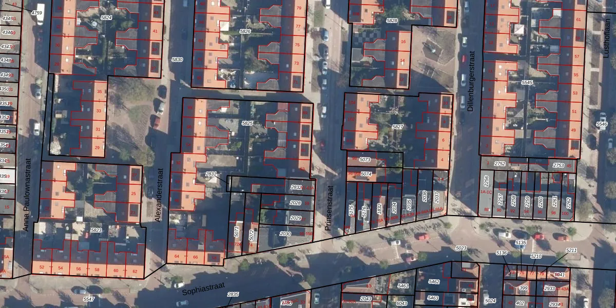 Het perceel waarop Prinsenstraat 65 staat heeft een oppervlakte van 1645 m². Dit is een zeer groot perceel. De perceeloppervlakte wordt geregistreerd door het Kadaster. Gedetailleerde informatie over de maten van dit perceel kunt u vinden in het rapport Kadastrale kaart met maatvoering van Prinsenstraat 65.
