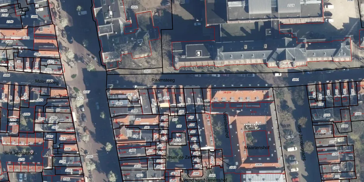Het perceel waarop Raamsteeg 11 staat heeft een oppervlakte van 52 m². Dit is een klein perceel. De perceeloppervlakte wordt geregistreerd door het Kadaster. Gedetailleerde informatie over de maten van dit perceel kunt u vinden in het rapport Kadastrale kaart met maatvoering van Raamsteeg 11.
