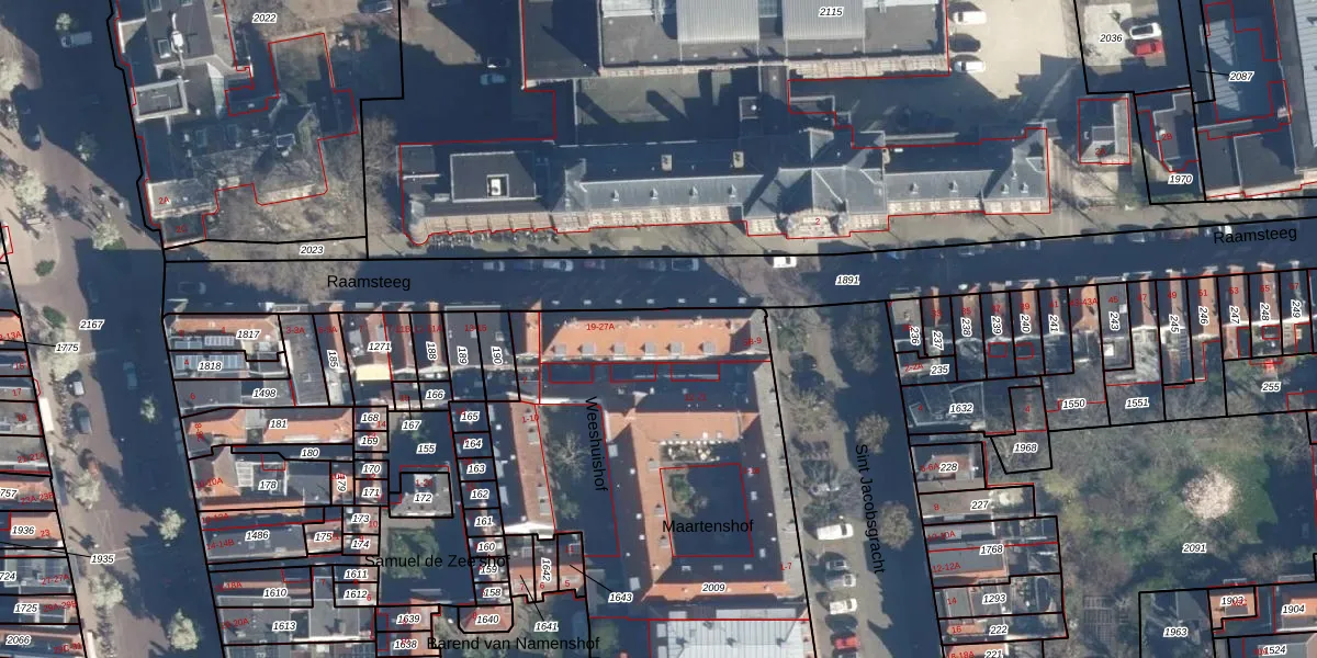 Het perceel waarop Raamsteeg 25-A staat heeft een oppervlakte van 2685 m². Dit is een zeer groot perceel. De perceeloppervlakte wordt geregistreerd door het Kadaster. Gedetailleerde informatie over de maten van dit perceel kunt u vinden in het rapport Kadastrale kaart met maatvoering van Raamsteeg 25-A.