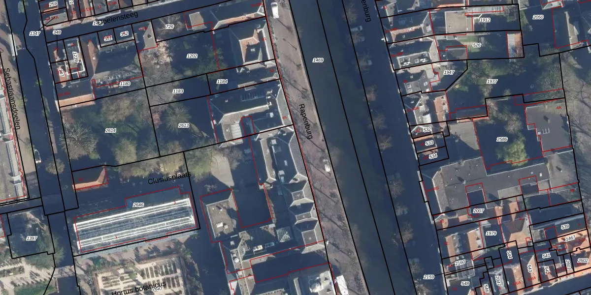 Het perceel waarop Rapenburg 67 staat heeft een oppervlakte van 4630 m². Dit is een zeer groot perceel. De perceeloppervlakte wordt geregistreerd door het Kadaster. Gedetailleerde informatie over de maten van dit perceel kunt u vinden in het rapport Kadastrale kaart met maatvoering van Rapenburg 67.
