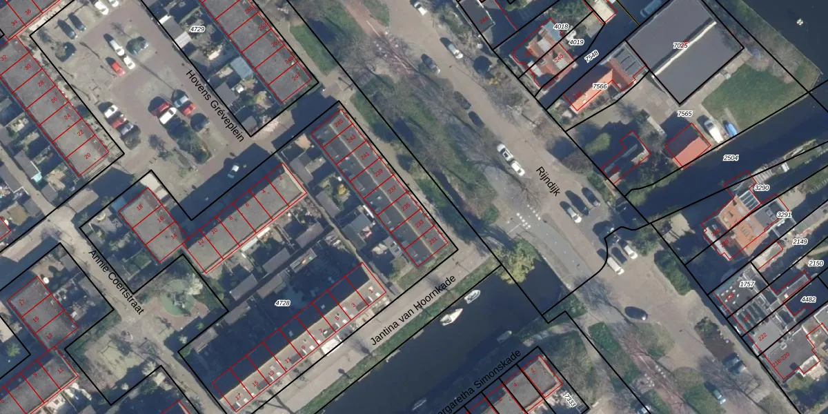 Rijndijk 235 is gelegen op kadastraal perceel LDN01W4728. Deze kadastrale aanduiding is uniek en wordt gebruikt door het Kadaster om eigendomsrechten en andere zakelijke rechten vast te leggen. Het perceel maakt onderdeel uit van de kadastrale gemeente Leiden.