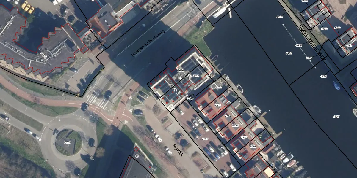 Rijndijk 350 is gelegen op kadastraal perceel LDN01W7711. Deze kadastrale aanduiding is uniek en wordt gebruikt door het Kadaster om eigendomsrechten en andere zakelijke rechten vast te leggen. Het perceel maakt onderdeel uit van de kadastrale gemeente Leiden.