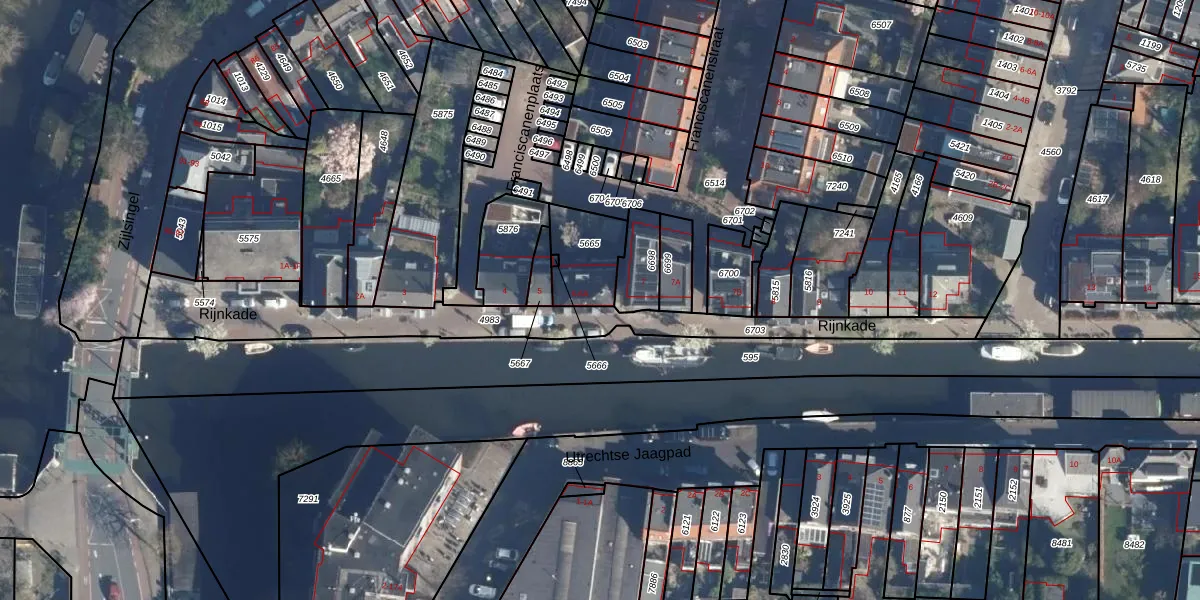 Rijnkade 6 is gelegen op kadastraal perceel LDN01K5665. Deze kadastrale aanduiding is uniek en wordt gebruikt door het Kadaster om eigendomsrechten en andere zakelijke rechten vast te leggen. Het perceel maakt onderdeel uit van de kadastrale gemeente Leiden.