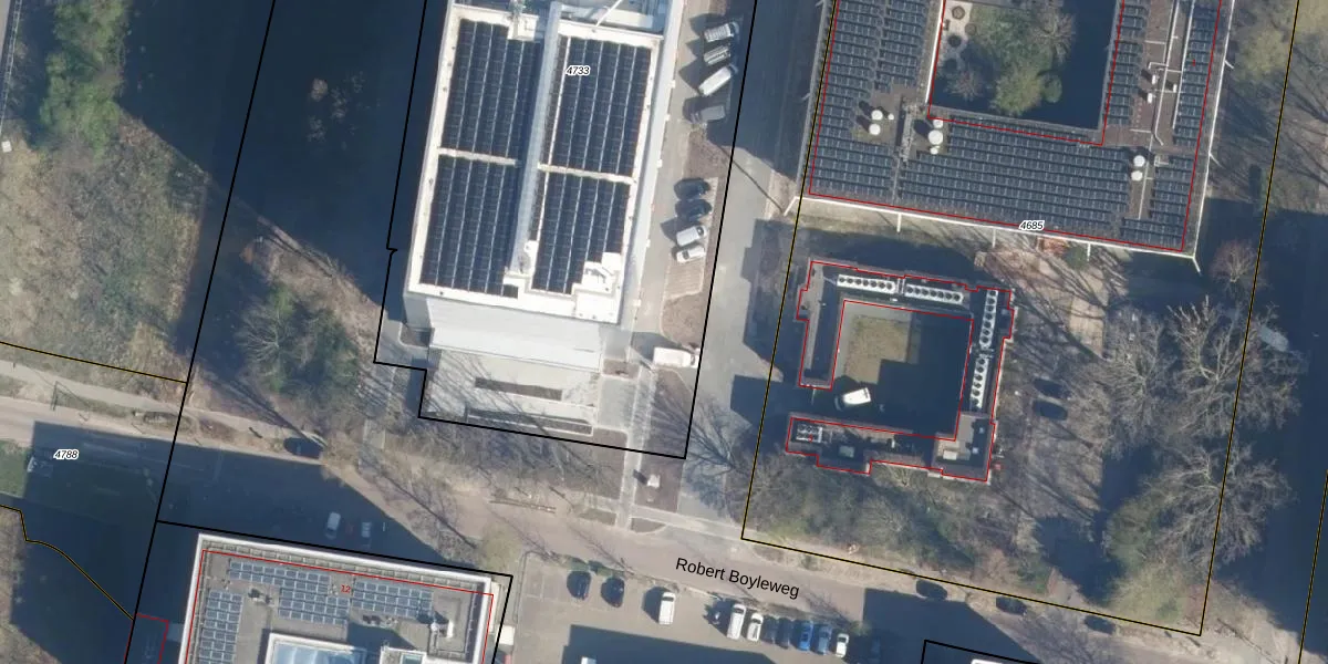 Het perceel waarop Robert Boyleweg 5-T-1 staat heeft een oppervlakte van 5300 m². Dit is een zeer groot perceel. De perceeloppervlakte wordt geregistreerd door het Kadaster. Gedetailleerde informatie over de maten van dit perceel kunt u vinden in het rapport Kadastrale kaart met maatvoering van Robert Boyleweg 5-T-1.