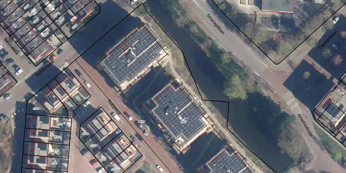 Het perceel waarop Robijnhof 10 staat heeft een oppervlakte van 3196 m². Dit is een zeer groot perceel. De perceeloppervlakte wordt geregistreerd door het Kadaster. Gedetailleerde informatie over de maten van dit perceel kunt u vinden in het rapport Kadastrale kaart met maatvoering van Robijnhof 10.