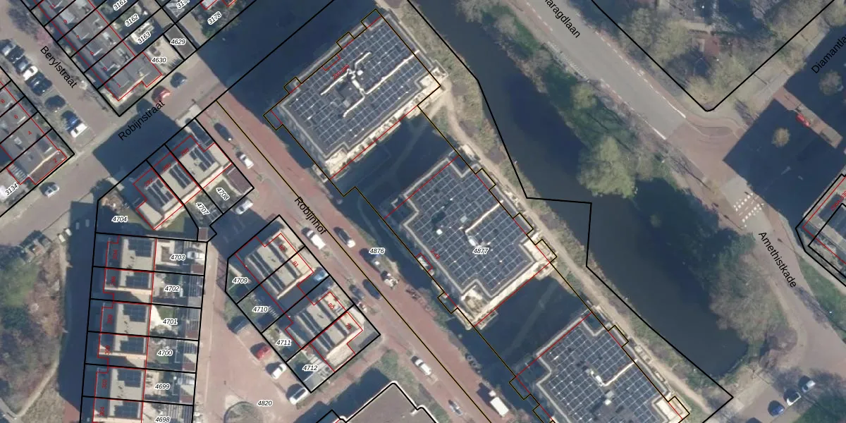 Het perceel waarop Robijnhof 14 staat heeft een oppervlakte van 3196 m². Dit is een zeer groot perceel. De perceeloppervlakte wordt geregistreerd door het Kadaster. Gedetailleerde informatie over de maten van dit perceel kunt u vinden in het rapport Kadastrale kaart met maatvoering van Robijnhof 14.