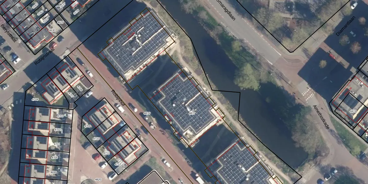Het perceel waarop Robijnhof 26 staat heeft een oppervlakte van 3196 m². Dit is een zeer groot perceel. De perceeloppervlakte wordt geregistreerd door het Kadaster. Gedetailleerde informatie over de maten van dit perceel kunt u vinden in het rapport Kadastrale kaart met maatvoering van Robijnhof 26.