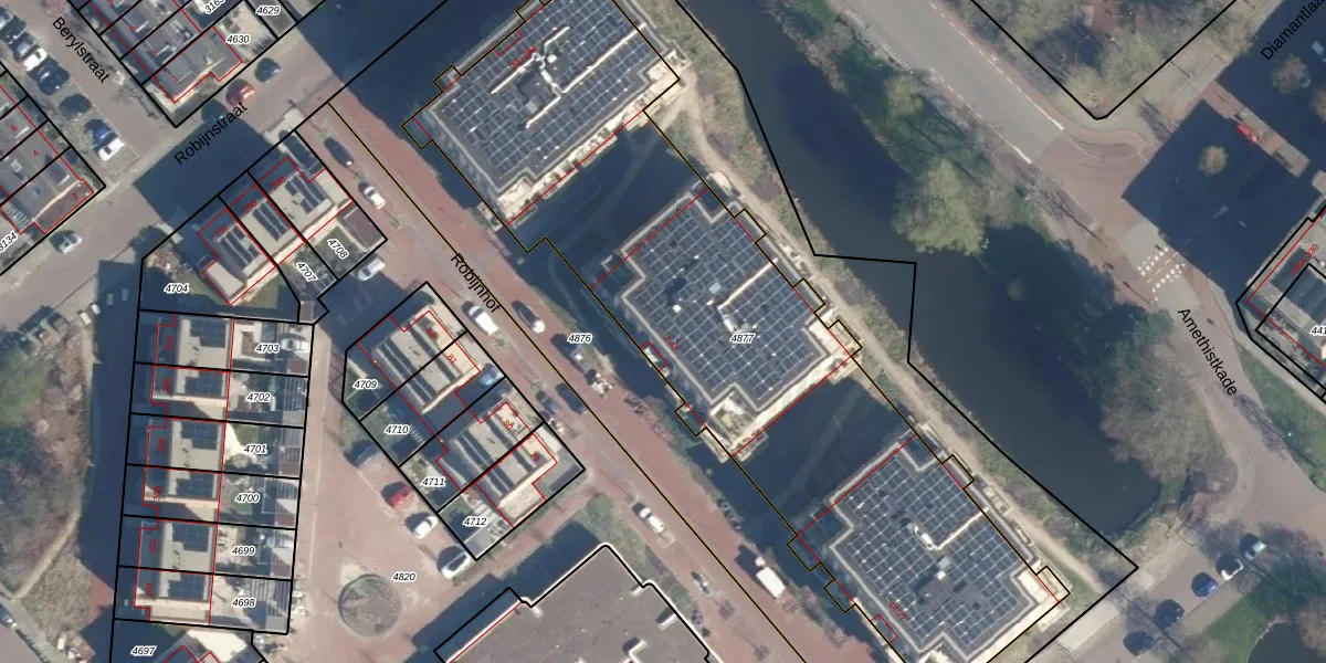 Het perceel waarop Robijnhof 30 staat heeft een oppervlakte van 3196 m². Dit is een zeer groot perceel. De perceeloppervlakte wordt geregistreerd door het Kadaster. Gedetailleerde informatie over de maten van dit perceel kunt u vinden in het rapport Kadastrale kaart met maatvoering van Robijnhof 30.