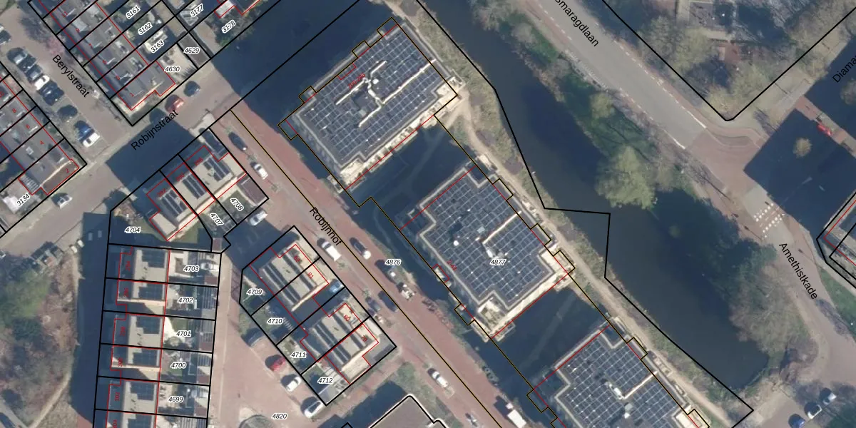 Het perceel waarop Robijnhof 4 staat heeft een oppervlakte van 3196 m². Dit is een zeer groot perceel. De perceeloppervlakte wordt geregistreerd door het Kadaster. Gedetailleerde informatie over de maten van dit perceel kunt u vinden in het rapport Kadastrale kaart met maatvoering van Robijnhof 4.