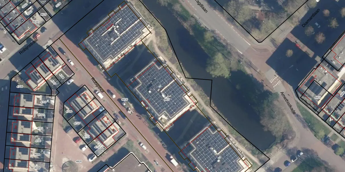 Het perceel waarop Robijnhof 42 staat heeft een oppervlakte van 3196 m². Dit is een zeer groot perceel. De perceeloppervlakte wordt geregistreerd door het Kadaster. Gedetailleerde informatie over de maten van dit perceel kunt u vinden in het rapport Kadastrale kaart met maatvoering van Robijnhof 42.