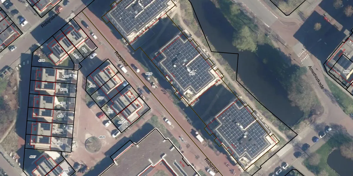 Het perceel waarop Robijnhof 43 staat heeft een oppervlakte van 3196 m². Dit is een zeer groot perceel. De perceeloppervlakte wordt geregistreerd door het Kadaster. Gedetailleerde informatie over de maten van dit perceel kunt u vinden in het rapport Kadastrale kaart met maatvoering van Robijnhof 43.