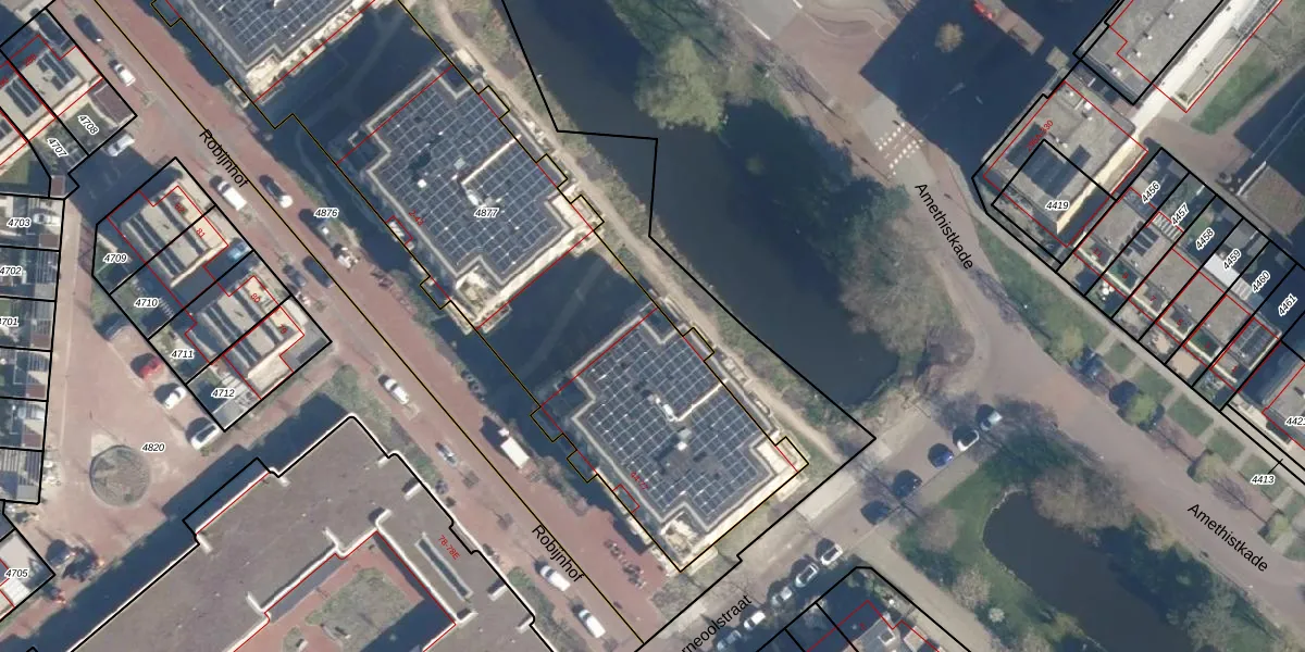Het perceel waarop Robijnhof 49 staat heeft een oppervlakte van 3196 m². Dit is een zeer groot perceel. De perceeloppervlakte wordt geregistreerd door het Kadaster. Gedetailleerde informatie over de maten van dit perceel kunt u vinden in het rapport Kadastrale kaart met maatvoering van Robijnhof 49.