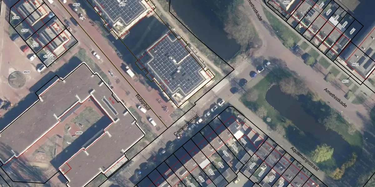 Het perceel waarop Robijnhof 74 staat heeft een oppervlakte van 3196 m². Dit is een zeer groot perceel. De perceeloppervlakte wordt geregistreerd door het Kadaster. Gedetailleerde informatie over de maten van dit perceel kunt u vinden in het rapport Kadastrale kaart met maatvoering van Robijnhof 74.