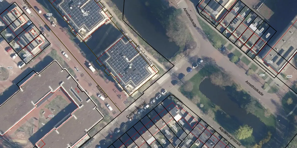 Het perceel waarop Robijnhof 77 staat heeft een oppervlakte van 3196 m². Dit is een zeer groot perceel. De perceeloppervlakte wordt geregistreerd door het Kadaster. Gedetailleerde informatie over de maten van dit perceel kunt u vinden in het rapport Kadastrale kaart met maatvoering van Robijnhof 77.