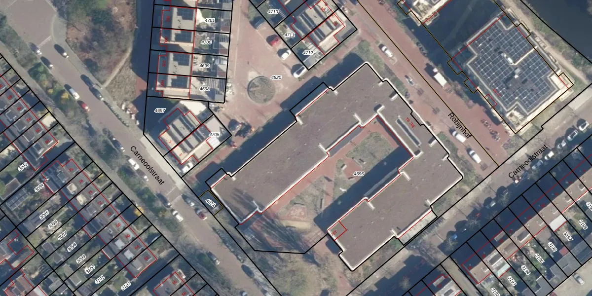Het perceel waarop het adres ligt is LDN01-X-4696. De afkorting 'LDN01' staat voor kadastrale gemeente Leiden. De gemiddelde perceeloppervlakte in de kadastrale gemeente Leiden is 703,94 m². Dit perceel is met zijn 3335 m² dus groter dan gemiddeld. De grootste perceeloppervlakte in de kadastrale gemeente is 51,8 ha. De kleinste oppervlakte bedraagt 0 m². Op het perceel liggen in totaal 7 adressen. De huidige grenzen van het perceel zijn digitaal in de Basisregistratie Kadaster (BRK) geregistreerd op 05-11-2024.