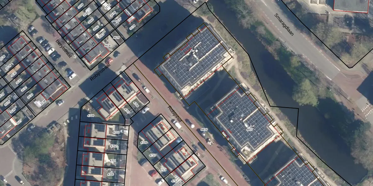 Het perceel waarop Robijnstraat 282 staat heeft een oppervlakte van 3196 m². Dit is een zeer groot perceel. De perceeloppervlakte wordt geregistreerd door het Kadaster. Gedetailleerde informatie over de maten van dit perceel kunt u vinden in het rapport Kadastrale kaart met maatvoering van Robijnstraat 282.