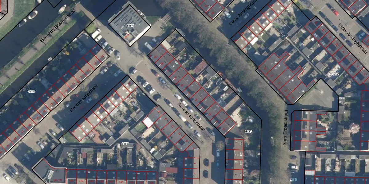 Ronner-Knipstraat 21 is gelegen op kadastraal perceel LDN01W6456. Deze kadastrale aanduiding is uniek en wordt gebruikt door het Kadaster om eigendomsrechten en andere zakelijke rechten vast te leggen. Het perceel maakt onderdeel uit van de kadastrale gemeente Leiden.