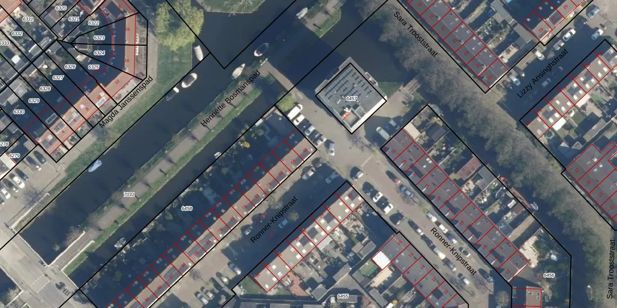Ronner-Knipstraat 65 is gelegen op kadastraal perceel LDN01W6458. Deze kadastrale aanduiding is uniek en wordt gebruikt door het Kadaster om eigendomsrechten en andere zakelijke rechten vast te leggen. Het perceel maakt onderdeel uit van de kadastrale gemeente Leiden.
