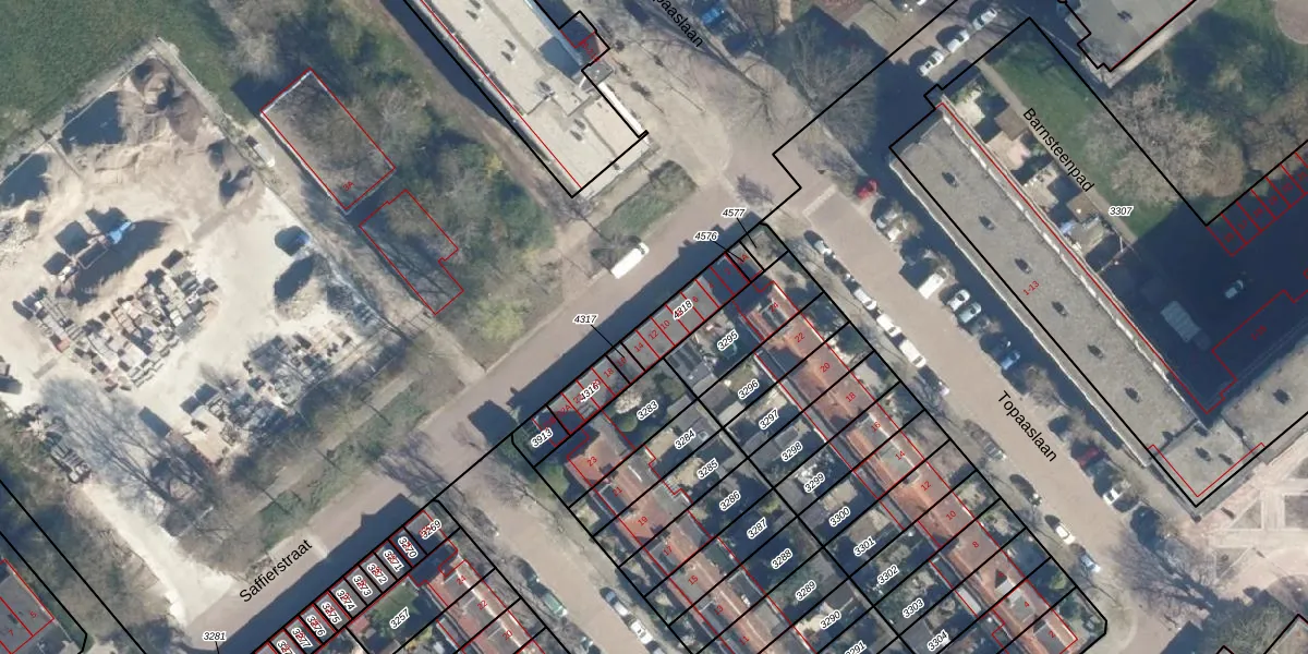 Saffierstraat 12 is gelegen op kadastraal perceel LDN01X4318. Deze kadastrale aanduiding is uniek en wordt gebruikt door het Kadaster om eigendomsrechten en andere zakelijke rechten vast te leggen. Het perceel maakt onderdeel uit van de kadastrale gemeente Leiden.