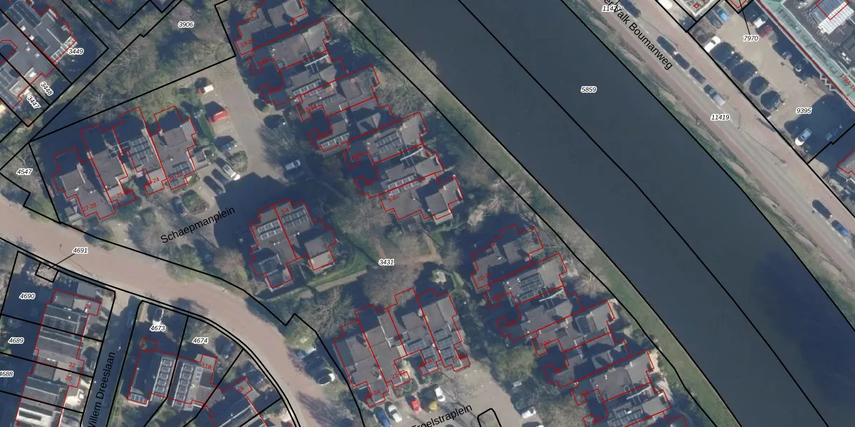 Het perceel waarop Schaepmanplein 5 staat heeft een oppervlakte van 8450 m². Dit is een zeer groot perceel. De perceeloppervlakte wordt geregistreerd door het Kadaster. Gedetailleerde informatie over de maten van dit perceel kunt u vinden in het rapport Kadastrale kaart met maatvoering van Schaepmanplein 5.