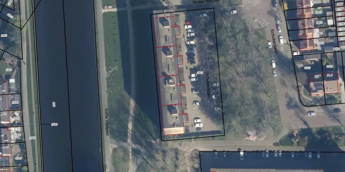 Schubertlaan 215 is gelegen op kadastraal perceel LDN01O2823. Deze kadastrale aanduiding is uniek en wordt gebruikt door het Kadaster om eigendomsrechten en andere zakelijke rechten vast te leggen. Het perceel maakt onderdeel uit van de kadastrale gemeente Leiden.