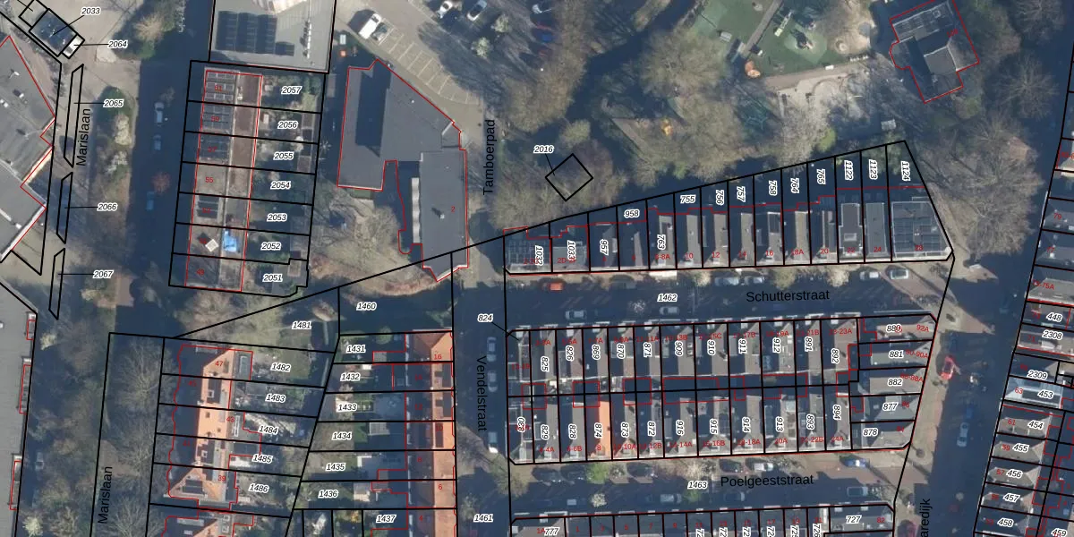 Het perceel waarop Schutterstraat 2-B staat heeft een oppervlakte van 77 m². Dit is een klein perceel. De perceeloppervlakte wordt geregistreerd door het Kadaster. Gedetailleerde informatie over de maten van dit perceel kunt u vinden in het rapport Kadastrale kaart met maatvoering van Schutterstraat 2-B.