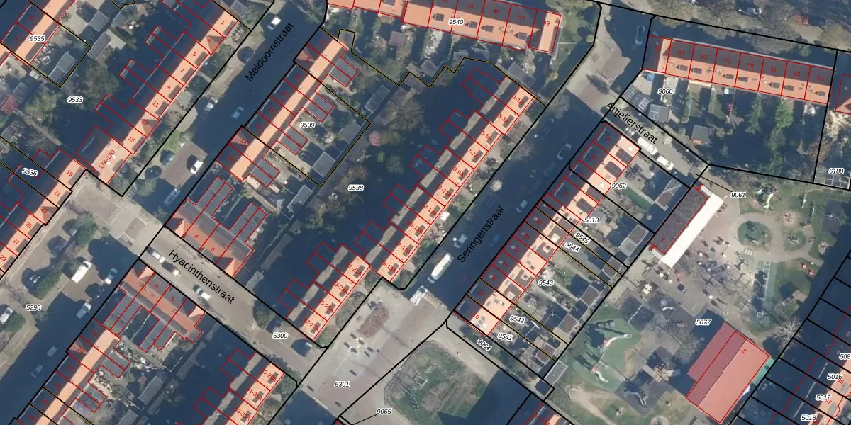 Het perceel waarop Seringenstraat 13-A staat heeft een oppervlakte van 3075 m². Dit is een zeer groot perceel. De perceeloppervlakte wordt geregistreerd door het Kadaster. Gedetailleerde informatie over de maten van dit perceel kunt u vinden in het rapport Kadastrale kaart met maatvoering van Seringenstraat 13-A.