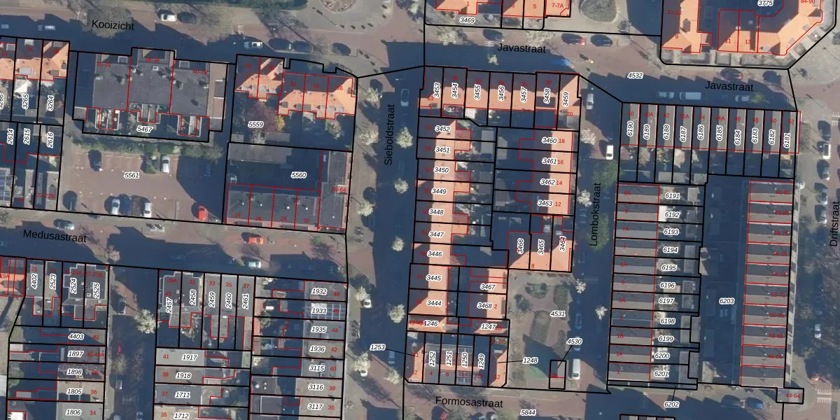 Gebruik de zoekbalk of klik op een perceel voor informatie over de adressen binnen dit perceel.