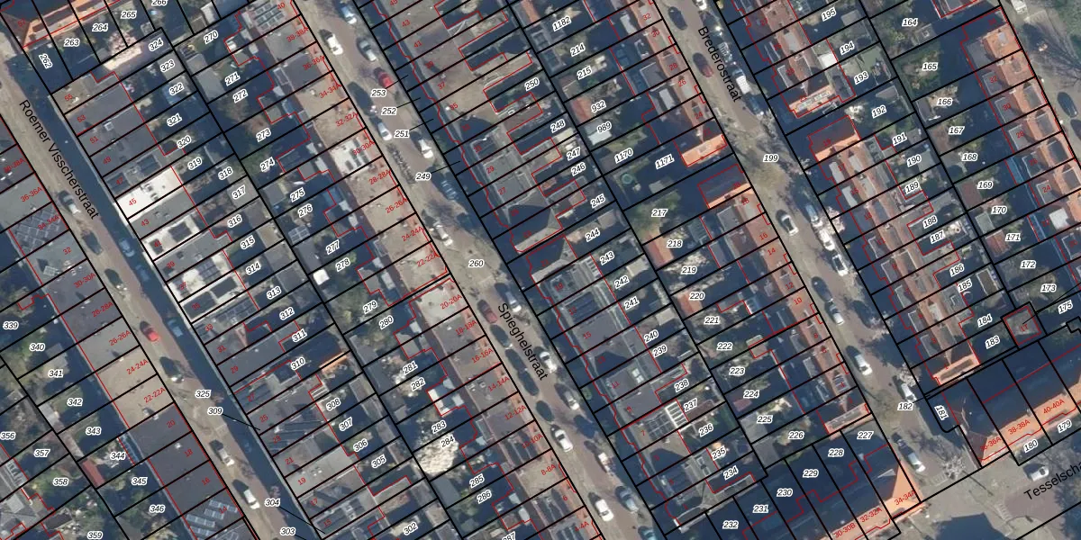 Het perceel waarop Spieghelstraat 21 staat heeft een oppervlakte van 137 m². Dit is een middelgroot perceel. De perceeloppervlakte wordt geregistreerd door het Kadaster. Gedetailleerde informatie over de maten van dit perceel kunt u vinden in het rapport Kadastrale kaart met maatvoering van Spieghelstraat 21.