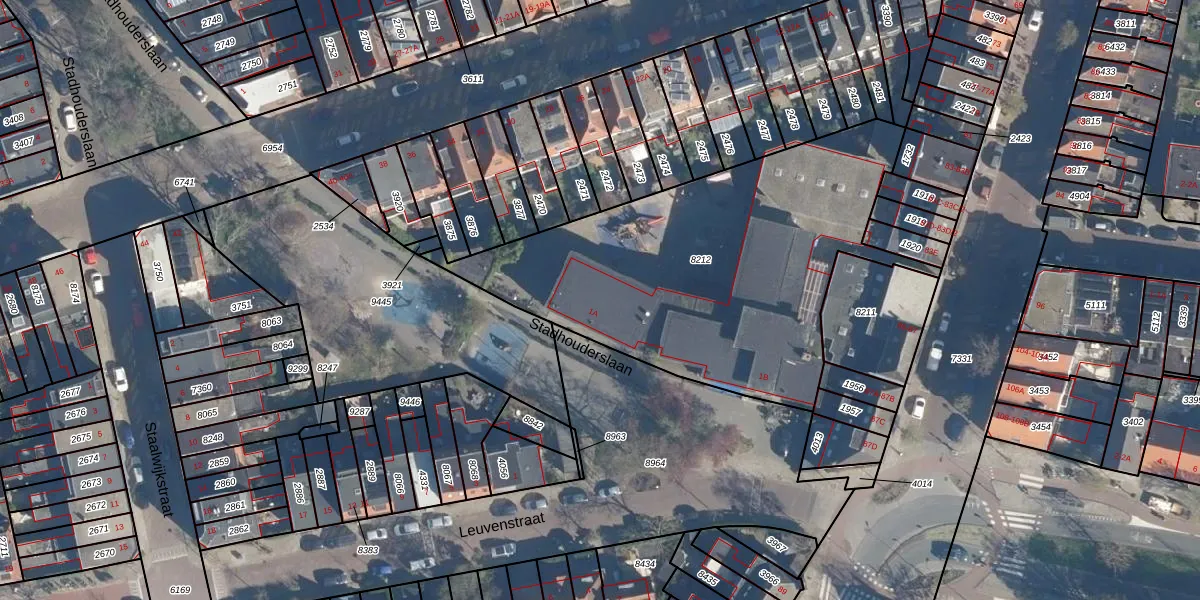 Stadhouderslaan 1-A is gelegen op kadastraal perceel LDN01M8212. Deze kadastrale aanduiding is uniek en wordt gebruikt door het Kadaster om eigendomsrechten en andere zakelijke rechten vast te leggen. Het perceel maakt onderdeel uit van de kadastrale gemeente Leiden.