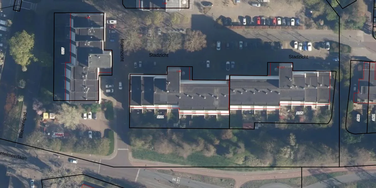 Het perceel waarop Stadzicht 36 staat heeft een oppervlakte van 1525 m². Dit is een zeer groot perceel. De perceeloppervlakte wordt geregistreerd door het Kadaster. Gedetailleerde informatie over de maten van dit perceel kunt u vinden in het rapport Kadastrale kaart met maatvoering van Stadzicht 36.