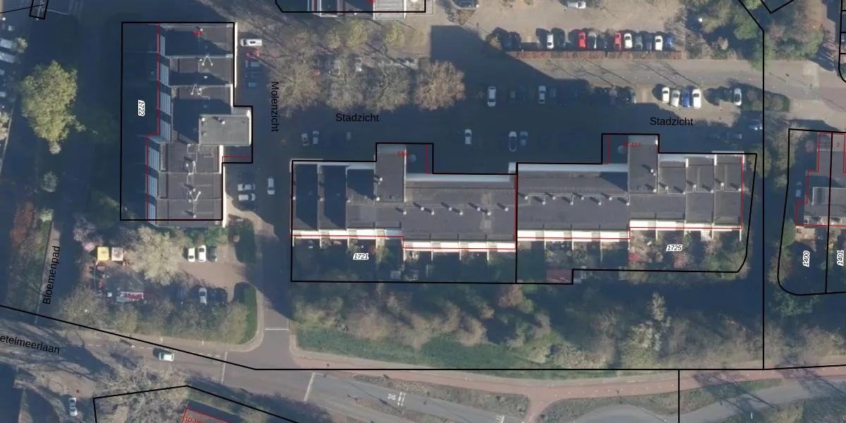 Het perceel waarop Stadzicht 44 staat heeft een oppervlakte van 1525 m². Dit is een zeer groot perceel. De perceeloppervlakte wordt geregistreerd door het Kadaster. Gedetailleerde informatie over de maten van dit perceel kunt u vinden in het rapport Kadastrale kaart met maatvoering van Stadzicht 44.