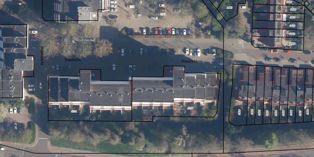 Het perceel waarop Stadzicht 63 staat heeft een oppervlakte van 1590 m². Dit is een zeer groot perceel. De perceeloppervlakte wordt geregistreerd door het Kadaster. Gedetailleerde informatie over de maten van dit perceel kunt u vinden in het rapport Kadastrale kaart met maatvoering van Stadzicht 63.