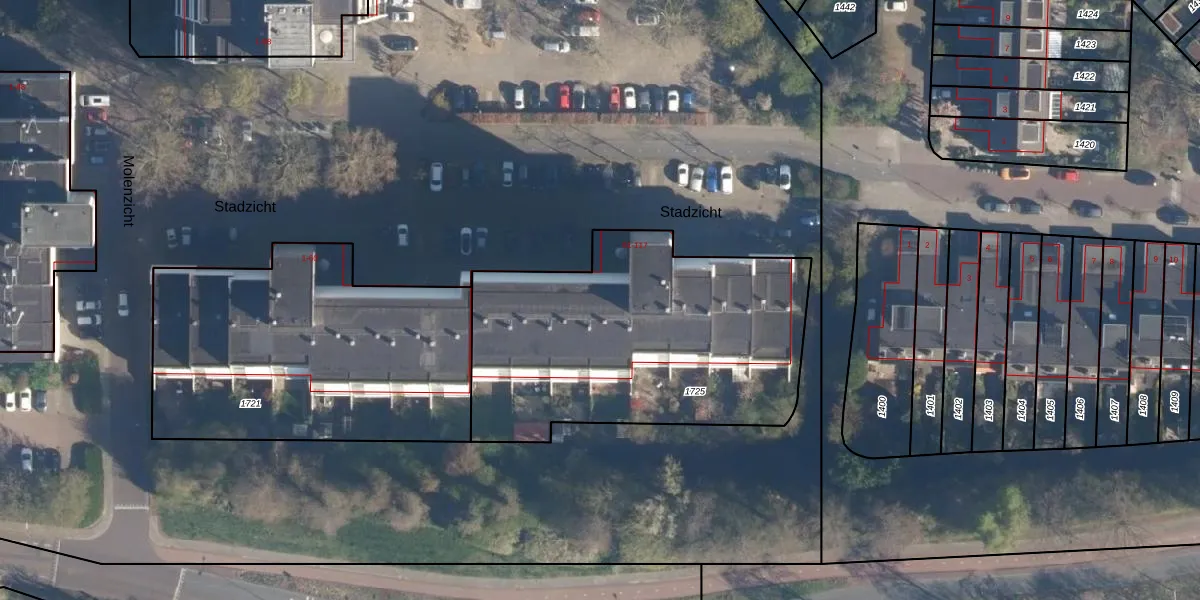 Het perceel waarop Stadzicht 79 staat heeft een oppervlakte van 1590 m². Dit is een zeer groot perceel. De perceeloppervlakte wordt geregistreerd door het Kadaster. Gedetailleerde informatie over de maten van dit perceel kunt u vinden in het rapport Kadastrale kaart met maatvoering van Stadzicht 79.