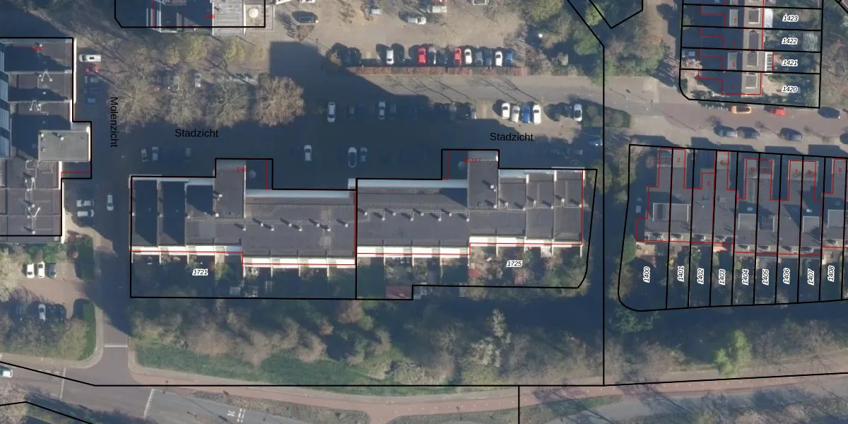 Het perceel waarop Stadzicht 94 staat heeft een oppervlakte van 1590 m². Dit is een zeer groot perceel. De perceeloppervlakte wordt geregistreerd door het Kadaster. Gedetailleerde informatie over de maten van dit perceel kunt u vinden in het rapport Kadastrale kaart met maatvoering van Stadzicht 94.