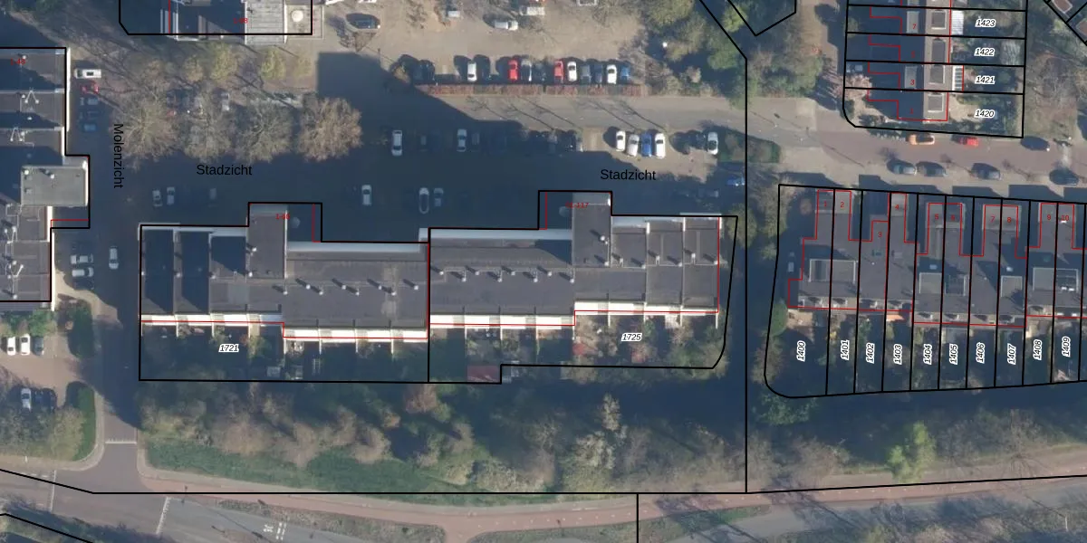Het perceel waarop Stadzicht 95 staat heeft een oppervlakte van 1590 m². Dit is een zeer groot perceel. De perceeloppervlakte wordt geregistreerd door het Kadaster. Gedetailleerde informatie over de maten van dit perceel kunt u vinden in het rapport Kadastrale kaart met maatvoering van Stadzicht 95.