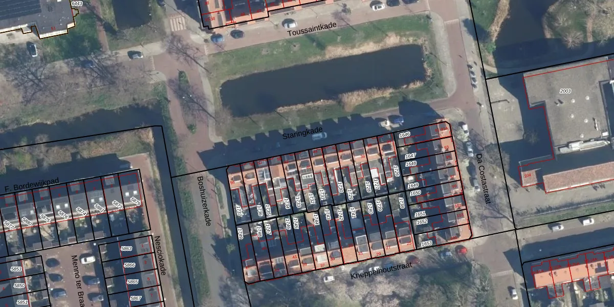 Staringkade 46 is gelegen op kadastraal perceel LDN01O1732. Deze kadastrale aanduiding is uniek en wordt gebruikt door het Kadaster om eigendomsrechten en andere zakelijke rechten vast te leggen. Het perceel maakt onderdeel uit van de kadastrale gemeente Leiden.