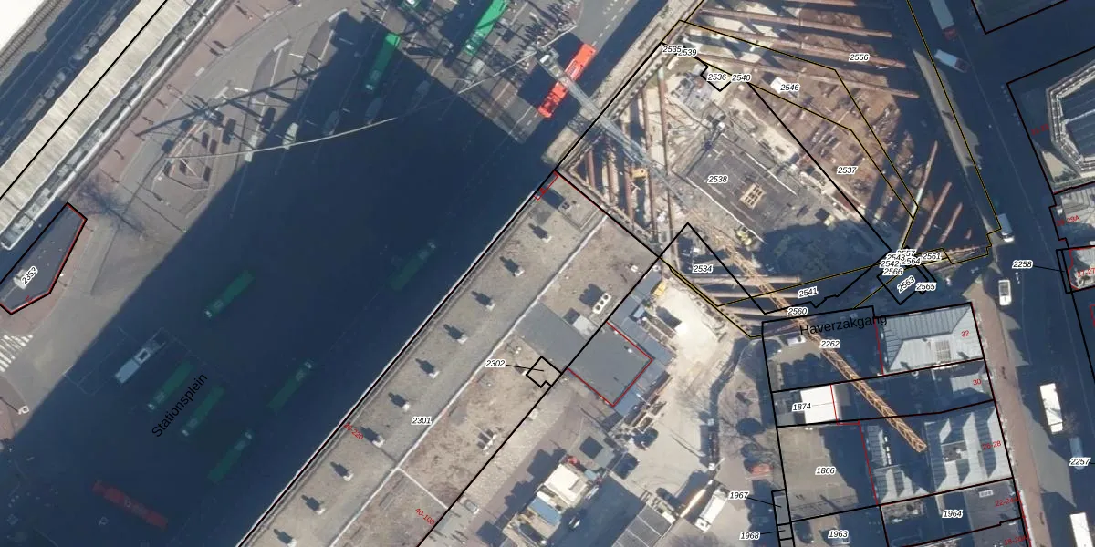 Het perceel waarop Stationsplein 106 staat heeft een oppervlakte van 2791 m². Dit is een zeer groot perceel. De perceeloppervlakte wordt geregistreerd door het Kadaster. Gedetailleerde informatie over de maten van dit perceel kunt u vinden in het rapport Kadastrale kaart met maatvoering van Stationsplein 106.