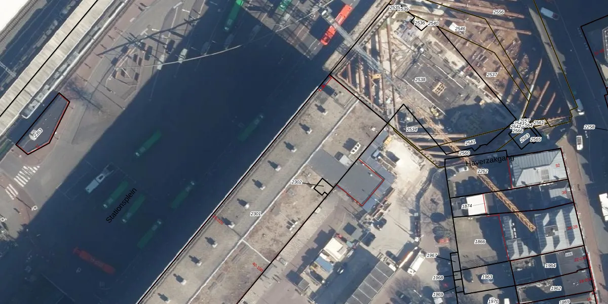 Het perceel waarop Stationsplein 82 staat heeft een oppervlakte van 2791 m². Dit is een zeer groot perceel. De perceeloppervlakte wordt geregistreerd door het Kadaster. Gedetailleerde informatie over de maten van dit perceel kunt u vinden in het rapport Kadastrale kaart met maatvoering van Stationsplein 82.