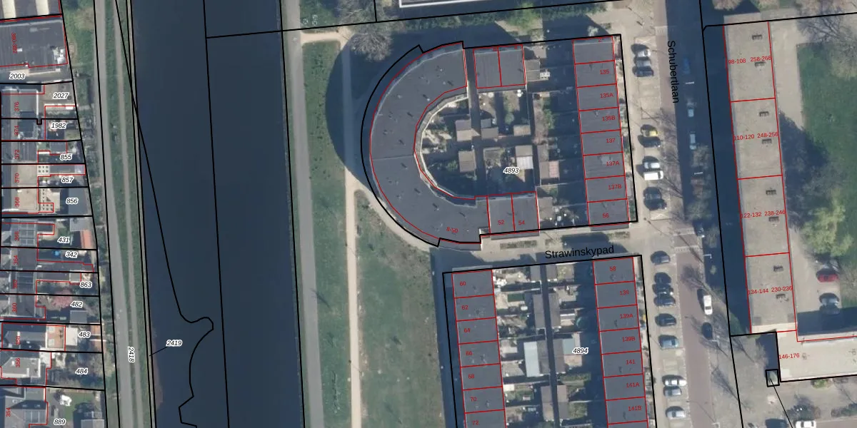 Het perceel waarop Strawinskypad 32 staat heeft een oppervlakte van 2608 m². Dit is een zeer groot perceel. De perceeloppervlakte wordt geregistreerd door het Kadaster. Gedetailleerde informatie over de maten van dit perceel kunt u vinden in het rapport Kadastrale kaart met maatvoering van Strawinskypad 32.
