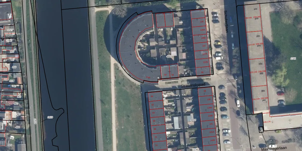 Het perceel waarop Strawinskypad 34 staat heeft een oppervlakte van 2608 m². Dit is een zeer groot perceel. De perceeloppervlakte wordt geregistreerd door het Kadaster. Gedetailleerde informatie over de maten van dit perceel kunt u vinden in het rapport Kadastrale kaart met maatvoering van Strawinskypad 34.