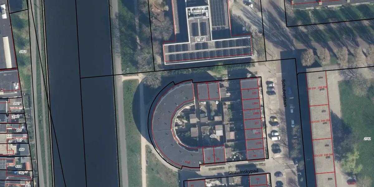 Het perceel waarop Strawinskypad 36 staat heeft een oppervlakte van 2608 m². Dit is een zeer groot perceel. De perceeloppervlakte wordt geregistreerd door het Kadaster. Gedetailleerde informatie over de maten van dit perceel kunt u vinden in het rapport Kadastrale kaart met maatvoering van Strawinskypad 36.