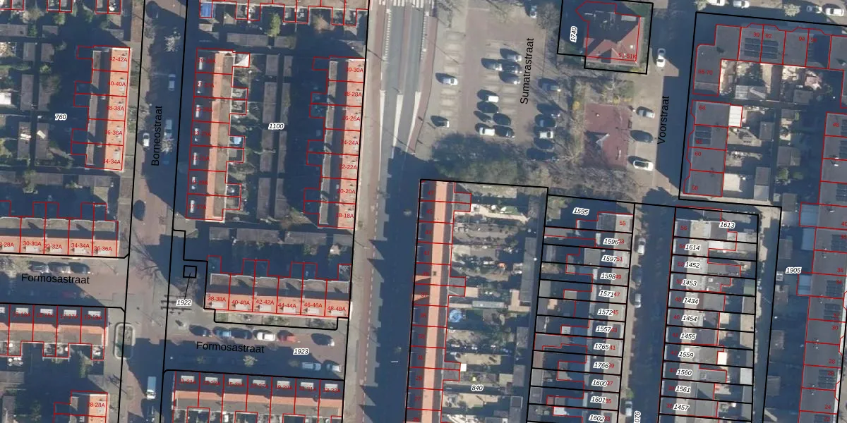 Het perceel waarop Sumatrastraat 45 staat heeft een oppervlakte van 3960 m². Dit is een zeer groot perceel. De perceeloppervlakte wordt geregistreerd door het Kadaster. Gedetailleerde informatie over de maten van dit perceel kunt u vinden in het rapport Kadastrale kaart met maatvoering van Sumatrastraat 45.