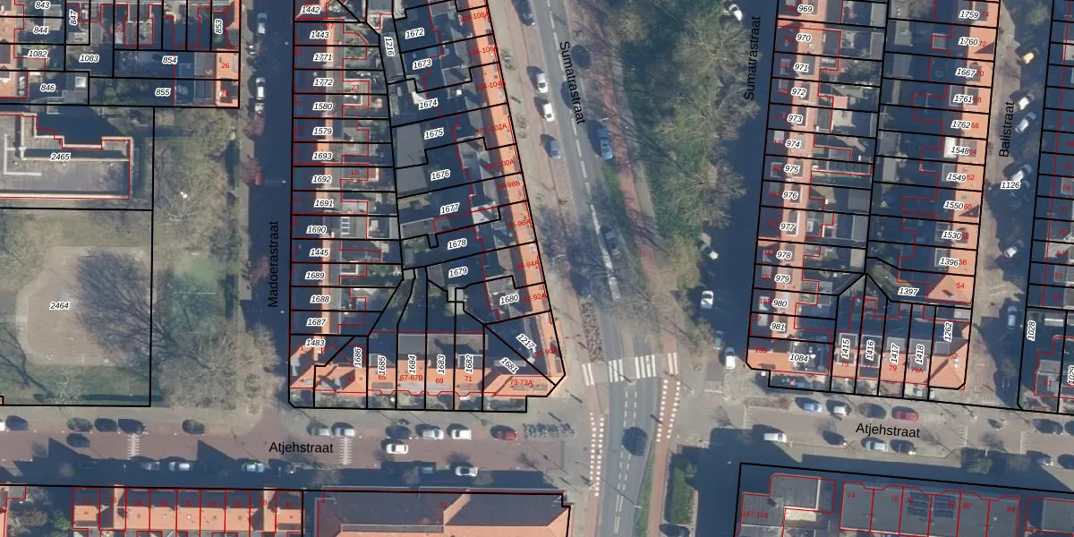 Sumatrastraat 94 is gelegen op kadastraal perceel LDN01N1679. Deze kadastrale aanduiding is uniek en wordt gebruikt door het Kadaster om eigendomsrechten en andere zakelijke rechten vast te leggen. Het perceel maakt onderdeel uit van de kadastrale gemeente Leiden.