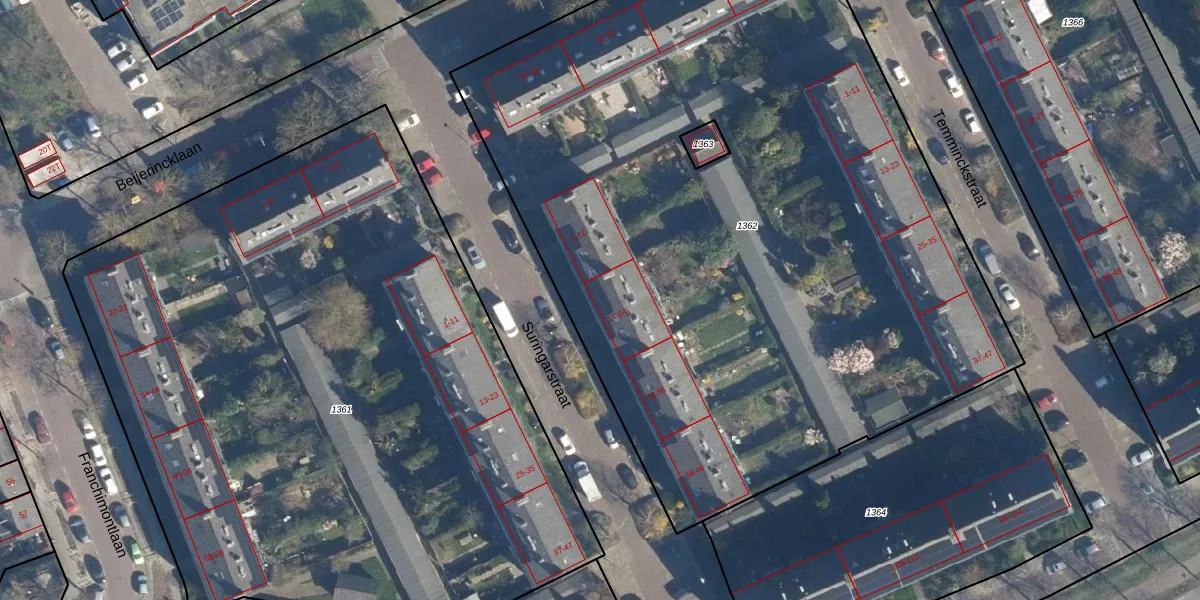 Suringarstraat 14 is gelegen op kadastraal perceel LDN01Q1362. Deze kadastrale aanduiding is uniek en wordt gebruikt door het Kadaster om eigendomsrechten en andere zakelijke rechten vast te leggen. Het perceel maakt onderdeel uit van de kadastrale gemeente Leiden.
